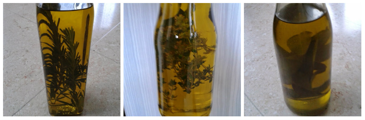 huile d'olive aromatiséeDans la première bouteille j’ai ajouté à l’huile d’olive des branches de romarins.Dans la deuxième bouteille  du thym et la troisième c’est des feuilles de sauge . Laisser macérer 2-3 mois et vous en servir ,dans les salades etc…