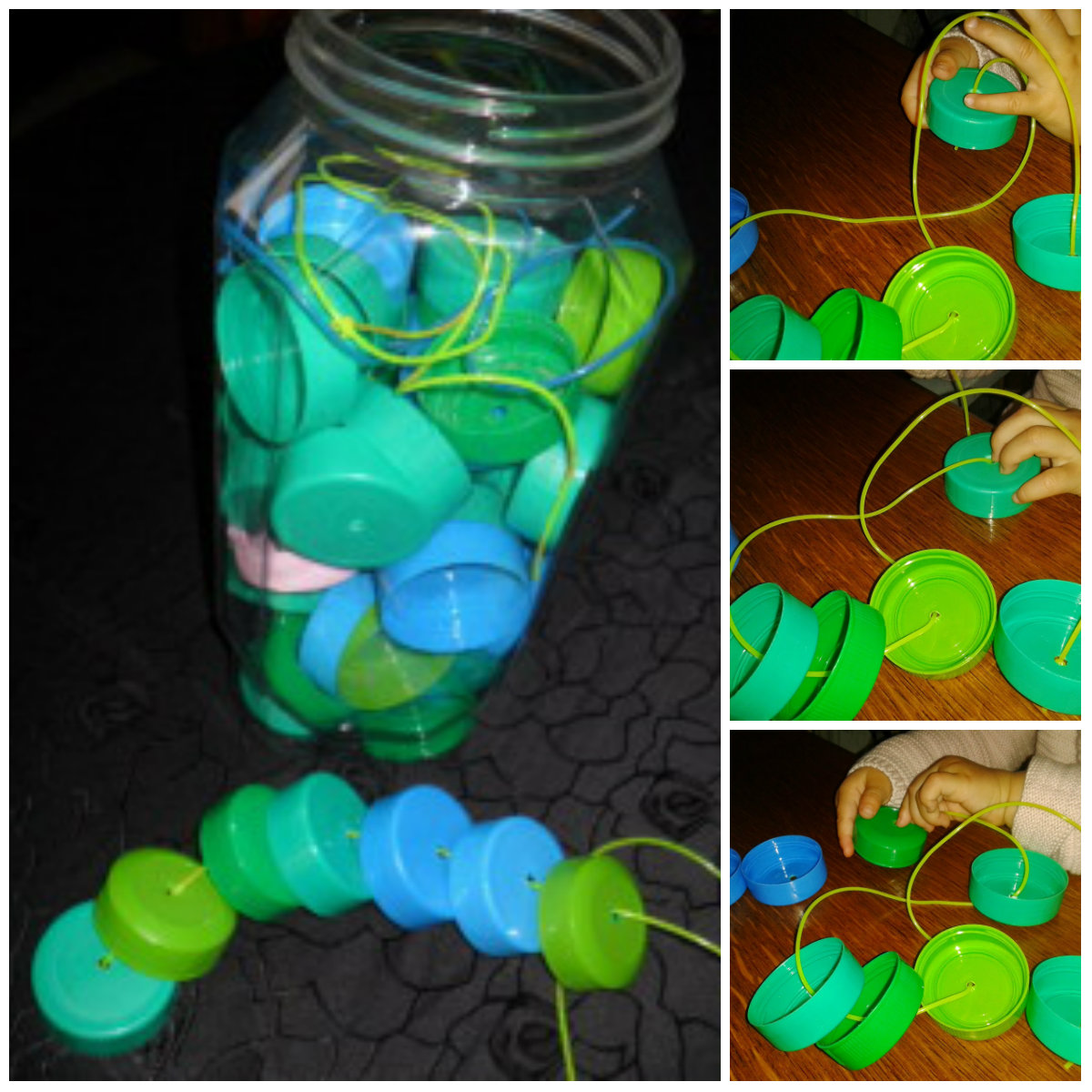 Quelque chose de simple ,qui occupe bien les enfants et qui recycle les bouchons .Faire un trou dans chaque milieu des bouchons à l’aide d’une aiguille à tricoter,pour le fil j’utilise un fil a scoubidou .On peut aussi leur apprendre les couleurs.C’est des enfants d’environs 18 mois et plus qui jouent avec.