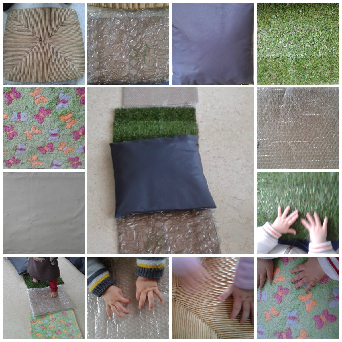 Sur des morceaux de carton de 40 cm x 40 cm j’ai collé différentes textures ,du papier bulle gros et fin ,de la fausse pelouse ,un dessus de chaise en paille, du velours un coussin en plastique,un tissu simple et un tissu plastifié.A partir de là je m’en sert soi en parcours :les enfants pieds nus ou en chaussettes passe dessus ou ils se mettent autour de ces carrés et les touches avec les mains ,ils peuvent me dire les doux ,les qui gratte etc…….