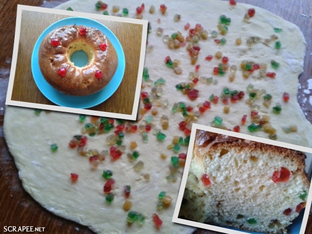 Étaler  la pâte en un grand rectangle puis répartir dessus les morceaux de fruits confits.La rouler sur elle même en faire un long boudin ,que l’on fermera pour faire une couronne.