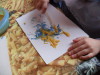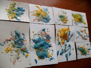 Faire peindre le support par l’enfant, il ne faut pas étaler la pâte (utiliser une cuillère par exemples), il faut qu’elle soit en couche épaisse sur le papier si on veut que la peinture gonfle.