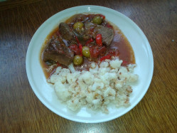Dans une cocotte faire revenir un peu d’huile d’olive des morceaux de bœuf braisé sur toutes les faces .Ajoutez 1 oignon émincé,de l’ail coupé finement , quand tout est bien doré ajouté du poivron coupé en lanière,1 bocal 1/2 l de tomate concassée,2 cuillères à café de paprika et un petit bocal d’olives aux amandes.Si la viande n’est pas couverte ajouter un peu d’eau .Couvrir et laisser mijoter pendant 1 h 30.Un peu avant la fin de la cuisson rajouter 1 cuillère à soupe de maïzena dilué dans un peu d’eau pour avoir un sauce onctueuse.