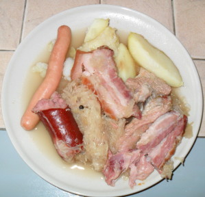 1 kg 500 de chou cru que j’ai bien rincé , avant de le mettre dans un faitout ,avec 1/4 l de vin blanc sec ,1/4 l de bouillon , du poivre en grains , des baies de genièvres ,de la coriandre ,1 petit jarret de porc demi-sel ,1 petit jarret de porc frais et laisser mijoter environ 2 h on vérifie qu’il y est assez de jus sinon on rajoute de l’eau .Ajoutez 3 tranches de lard fumée ,3 tranches de lard frais coupées en deux,3 saucisses fumées et 6 saucisses de Francfort ,laissez mijoter encore 1 h.Dans une casserole à part faites cuire des pommes de terre à l’eau.
