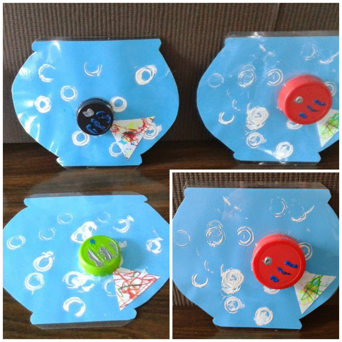 Avec les Loulous que je garde de  18 mois à 2 ans ,on a réalisé un joli poissons dans son bocal .Avec différentes techniques,sur plusieurs jours  .