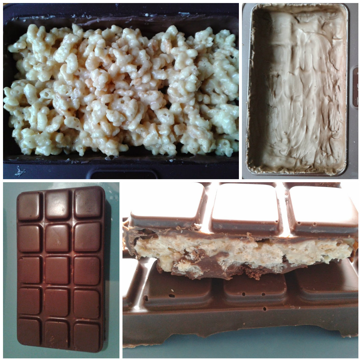 Dans le bol du thermomix5  mélanger  200 g de chocolat blanc fondu avec 2 cuillères à soupe  de lait 30 sec/vit 5. Ajouter 40 g de riz soufflé 2 min/sens inverse. Puis verser dans le moule ,remettre une couche de chocolat au lait par dessus .Laisser 3 heures au frais.Démouler et déguster.