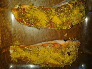 Sur 2 magrets de canard mettre un mélange d’épices curcuma , estragon , poivre rose,moutarde blanche, sel.
