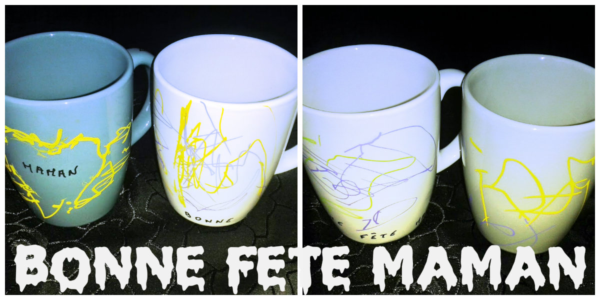 Donc les enfants ont donné toutes leurs créativités pour décorer ces tasses et moi j’ai écris  » Bonne fête maman  » le prénom de l’enfant et l’année . Fait avec des feutres « Posca » et passé au four 180° environ 45 mn.