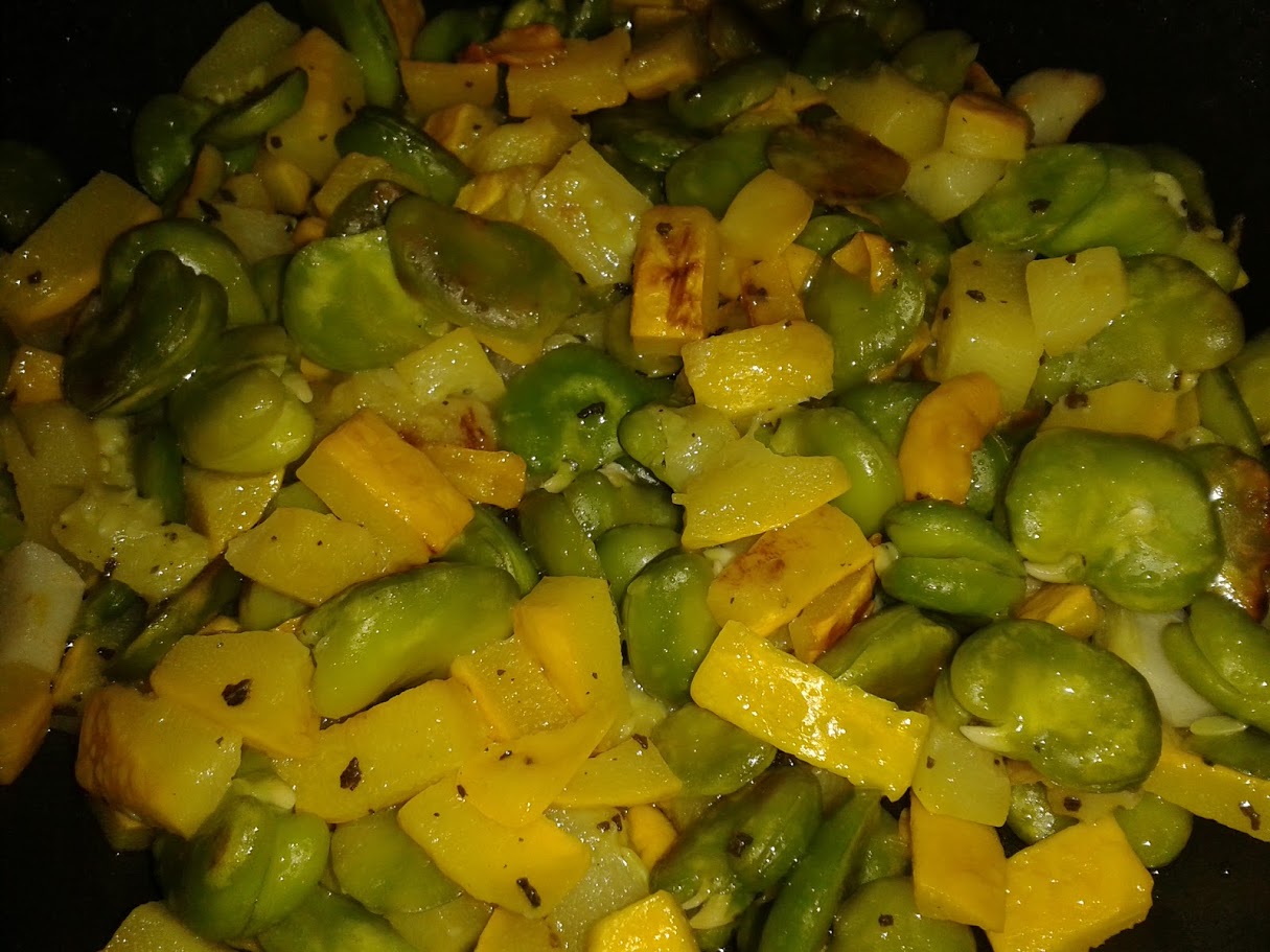 Dans le wok mettre 1 cuillère à soupe d’huile d’olive, des fèves, des  navets nouveaux et 1 courgette jaune coupées  en morceaux. Faire revenir  3min en remuant sans cesse.Puis laisser mijoter 10 minutes.