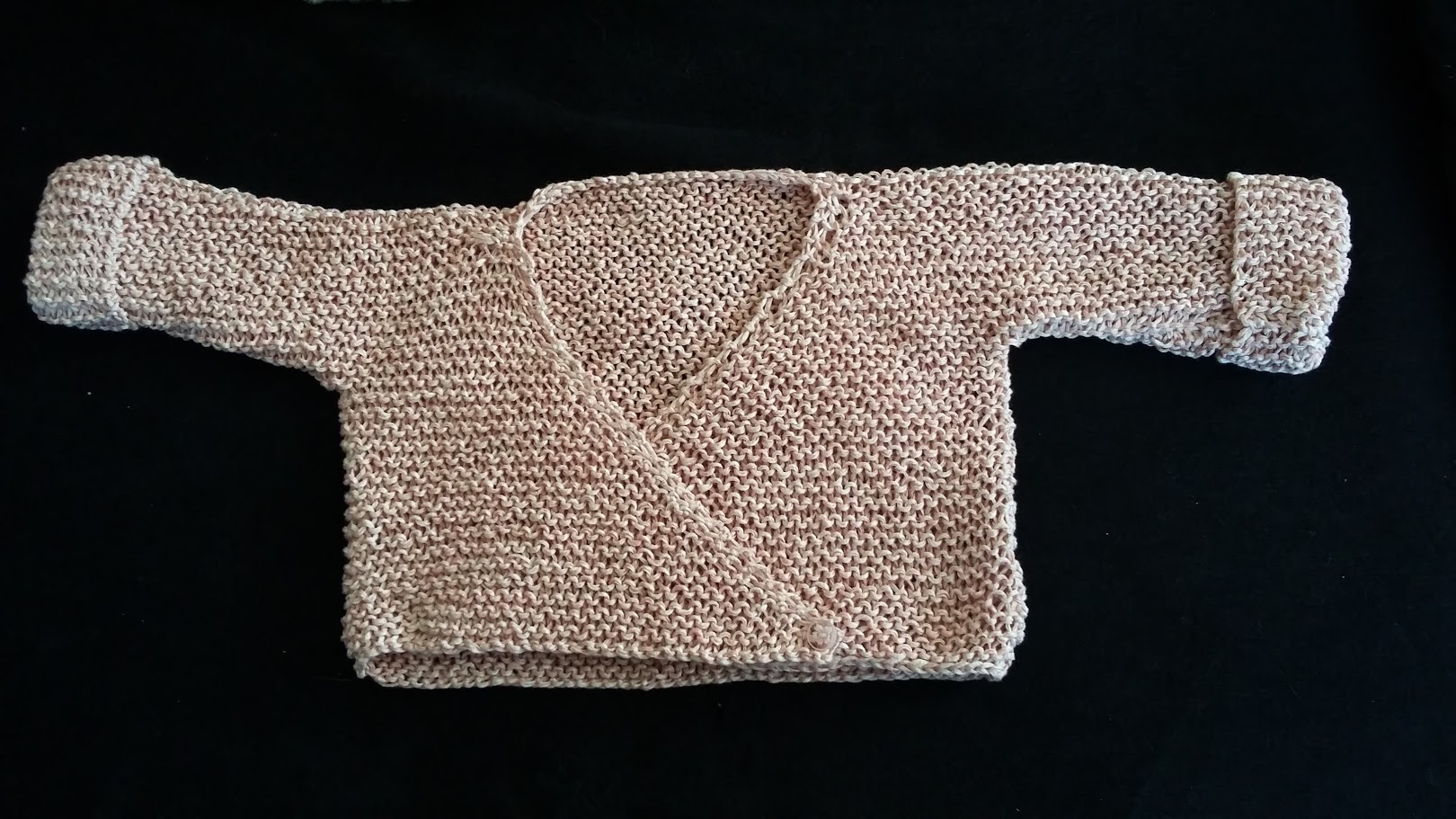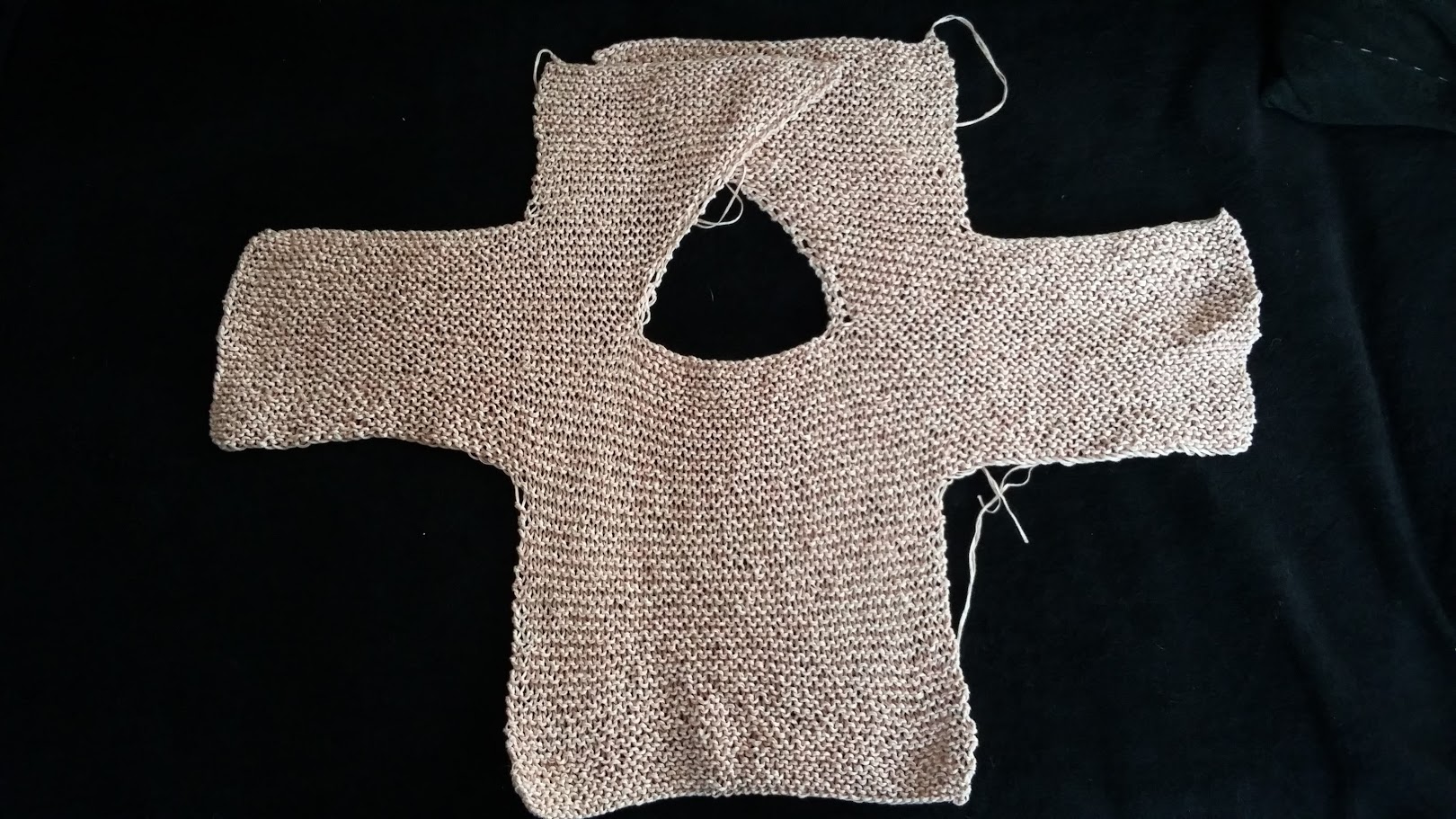 Tricoter au point mousse , côté encolure tricoter 1 maille , 2 mailles ensemble , 39 mailles , puis 2 rangs plus loin commencer les augmentations côté encolure en tricotant tous les 2 rangs 1 maille, 1 augmentation interne et le reste de mailles . A 14 cm de hauteur de manche , rabattre les 30 mailles et tricoter les mailles suivantes en continuant les augmentations . A 20cm de hauteur rabattre toutes les mailles .