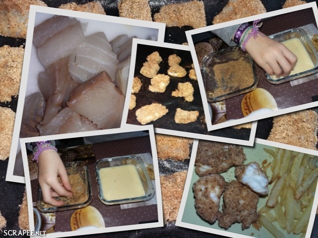 J’ai coupé en cube un filet de lieu épais , puis ma petite fille les a trempée dans un bol ou se trouvait 1 œuf et du lait battu , puis dans un bol rempli de chapelure .Nous avons disposé ces cubes sur une feuille en silicone . Enfourner à four chaud 180° pendant 20 min.