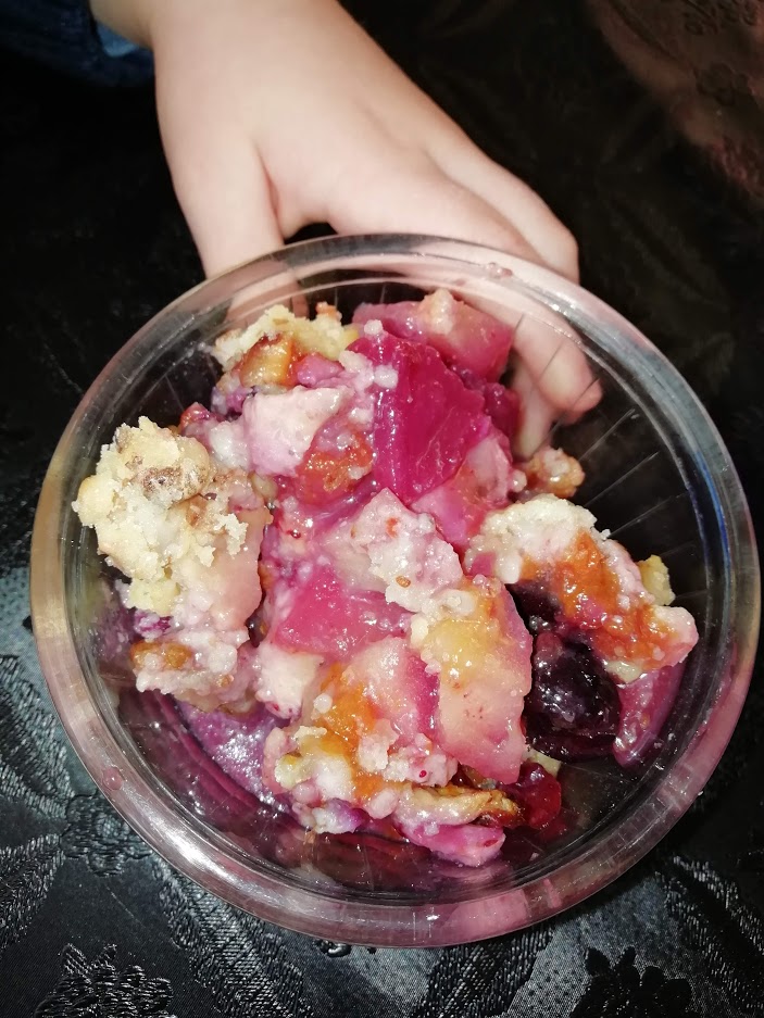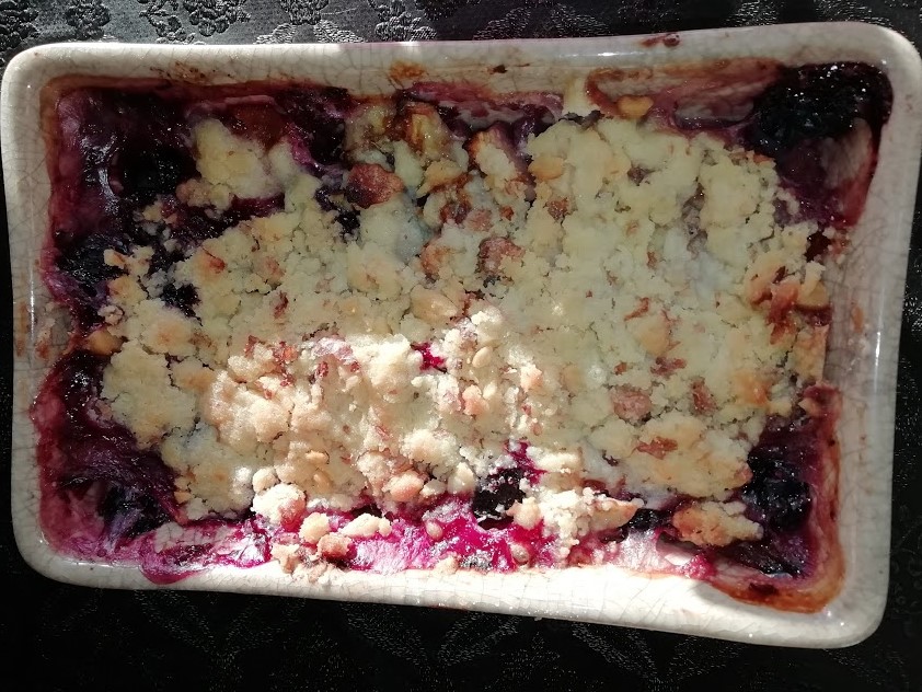 Dans un plat allant au four mettre 1 pomme épluchée et coupée en morceaux , 1 banane coupée en rondelles , des myrtilles et quelques abricots décongelés . Dans un saladier mélanger 20 g de farine , 20 g de beurre , 20 g de sucre , ajouter 20 g de noix en petits morceaux . Disposer se mélange sur les fruits . Mettre à four chaud 180° pendant 15 minutes.