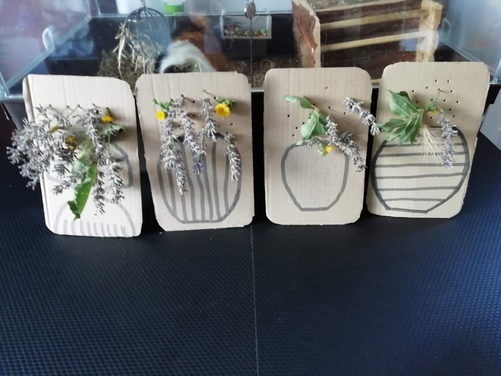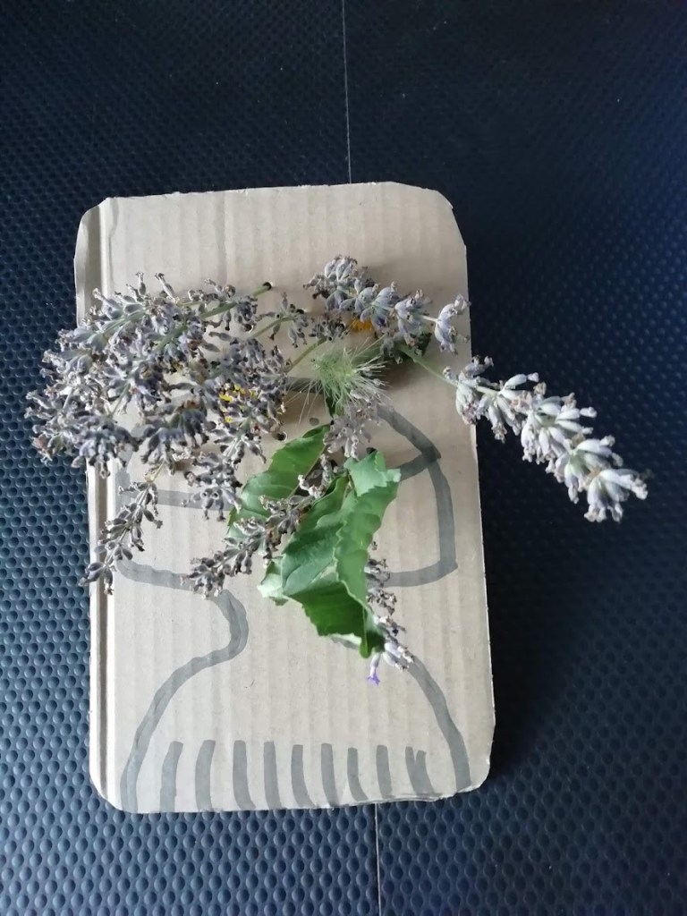 Dans un carton j’ai dessiner un vase fait des trous et les enfants les ont mis dans les trous après avoir ramassé différentes fleurs, lavande, feuille etc.