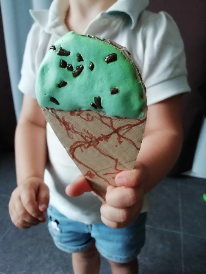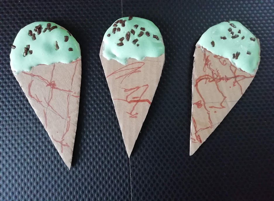 Pendant les fortes chaleurs nous avons réalisé ses petits glaces en bricolage avec les petits que je garde. Dans un bol mélanger à part égale de la mousse à raser et de la colle blanche , ajouter du colorant bleu et jaune. Bien mélanger. Les enfants à l’aide d’un bâton de glace on recouvert le haut du cornet. Parsemer de petits grains de chocolat.