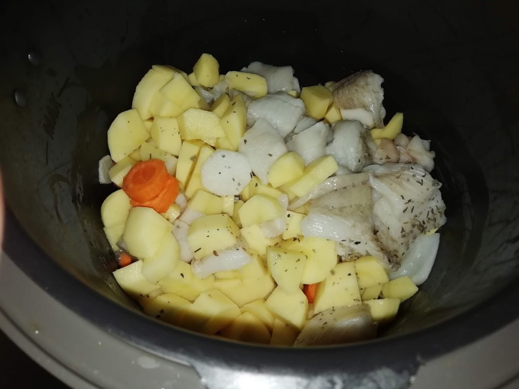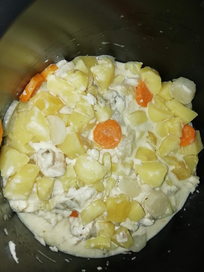 Dans la cuve du Cookéo mettre 2 c à s d’huile d’olive ,1 oignon émincé et du poissons en gros cubes ( selon votre gout ) pour moi du cabillaud et du colin . Mettre en mode doré . A la sonnerie ajouter des rondelles de carottes , de navet long (plus doux ) des pommes de terre , 150 ml d’eau et 1 c à c de sel aux herbes de Provence ici . Programmer l’appareil en mode cuisson rapide 10 min . A la sonnerie ouvrir l’appareil ajouter 20 cl de crème liquide et 1 c à s de maïzena bien mélanger jusqu’à obtenir une sauce homogène .Servir .