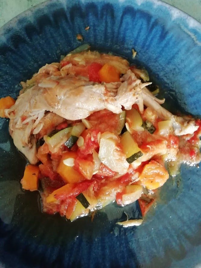 Dans la cuve du cookéo : mettre 1 c à s d’huile d’olive, 1 oignon, des morceaux de lapin. Programmer l’appareil en mode doré . À la fin du programme doré ajouter 1 courgette éplucher et couper en morceaux , 5 tomates , 4 carottes ,100 ml d’eau. Programmer en mode cuisson rapide pendant 20 minutes. À la sonnerie servir.