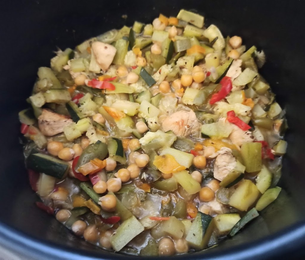 Programmer en mode doré. Dans la cuve du Cookéo mettre 2 c à s d’huile d’olive des dès d’escalopes de poulet et 1 oignon émincé . Faire dorer . A la sonnerie ajouter des courgettes coupées en dés , des pois chiches préalablement tremper une nuit dans de l’eau, des poivrons , du Raz-el-hanout , 150 ml d’eau . Programmer l’appareil en mode cuisson rapide pendant 10 min . A la sonnerie servir.