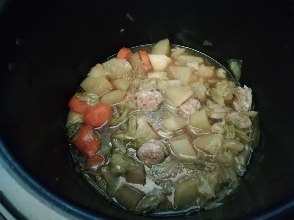 Dans la cuve de Cookéo mettre 1 c à s d’huile d’olive et 2 saucisses à la viande couper en morceaux les faire revenir . Ajouter 2 carottes coupées en rondelles , 3 pommes de terre épluchées et coupées en morceaux , 1 chou coupé en morceaux ajouter 150 ml d’eau. Mettre le Cookéo sous pression pendant 25 min . Servir .