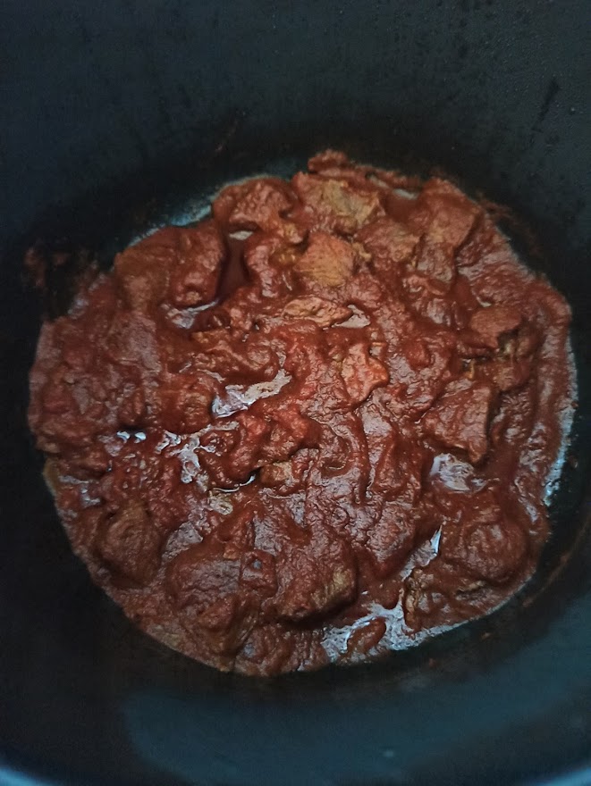 Démarrer le Cookéo et lancer le mode dorer . Ajouter 2 c à s d’huile d’olive, 1 oignon épluché et émincé et des morceaux de bœuf . Mélanger régulièrement pour bien dorer tous les ingrédients . A la sonnerie saupoudrer de paprika puis mélanger. Verser 200 g de tomates concassées coupées en morceaux , 70 ml d’eau environ . Lancer l’appareil mode cuisson sous pression pendant 40 minutes. À la sonnerie c’est prêt.