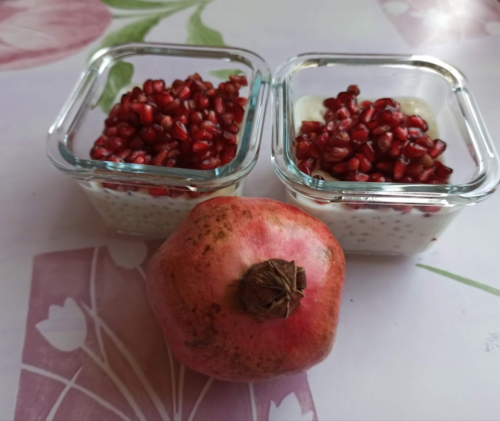 Dans une casserole verser 400 ml de lait entier ,40 g de perles du Japon , 30 g de sucre et 1 c à s de fleur d’oranger . Mélanger puis cuire en remuant souvent jusqu’à temps que les perles du Japon soit transparente . Verser dans des verrines, laisser refroidir. Mettre les graines de Grenade puis au frigo pendant 1 h .