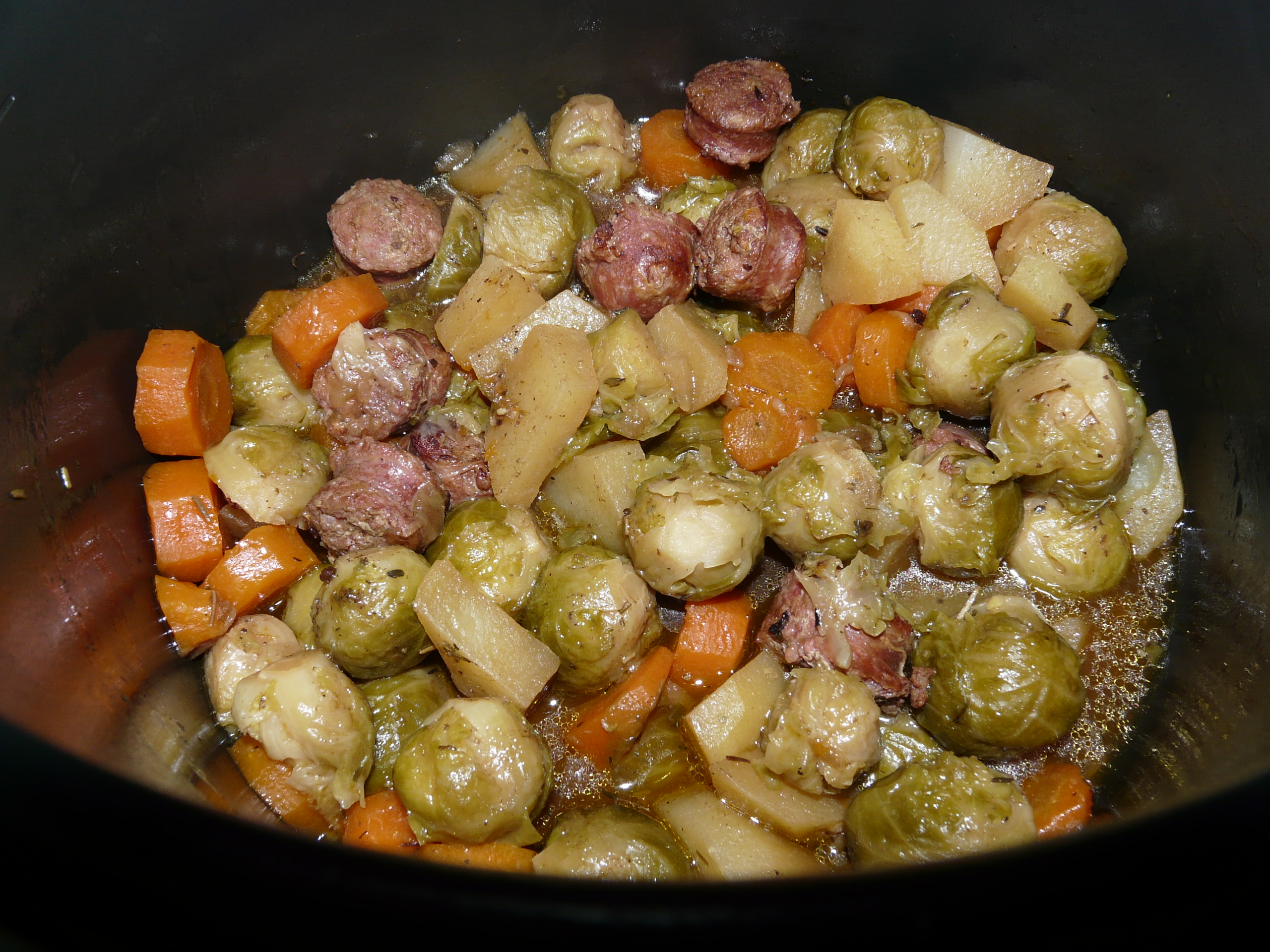 Mettre le Cookéo en mode dorer , ajouter dans la cuve 1c à s d’huile d’olive , 1 oignon émincé , 2 saucisses de Toulouse coupées en rondelles . Quand celles-ci sont bien dorées ajouter 4 carottes coupées en rondelles , 500 g de choux Bruxelles , 2 pommes de terre coupées en morceaux , 20 cl de bouillon de volaille et parsemer de sel aux herbes de Provence. Programmer l’appareil cuisson rapide 20 minutes . A la sonnerie c’est prêt , servir.