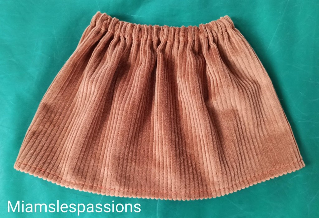 Jupe pour un bébé de 10 mois . Sa taille faisait 44 cm j’ai rajouté 22 cm + 12 cm et j’ai fait une hauteur de 22 cm . Cousu à la machine à coudre sauf le côté de la jupe que j’ai fait à la surjeteuse.