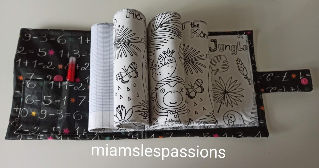 J’ai réalisé ces petits cahiers pour les enfants avec la possibilité d’y mettre 5 feutres effaçables sur le thème de la jungle et l’autre sur le thème de la mer.