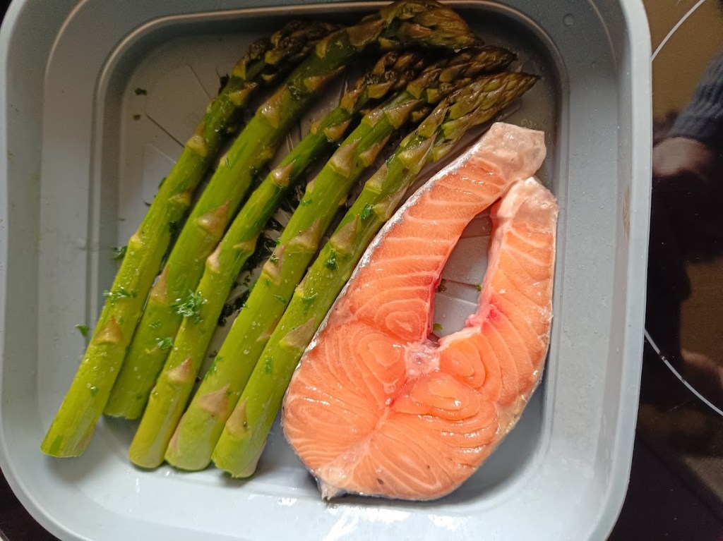 Mettre sur la grille de l’air fryer le darne de saumon à côté mettre quelques asperges vertes , vaporiser d’un peu d’huile d’olive puis programmer l’appareil 200°/8 min .A la sonnerie c’est prêt ,mettre quelques graines de fenouil.