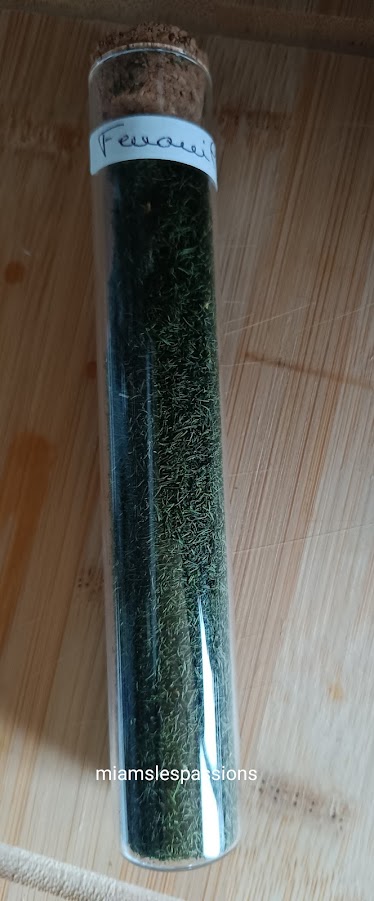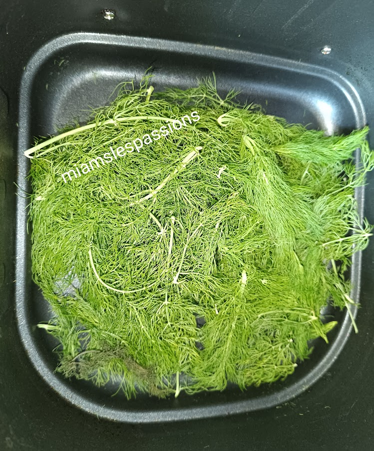 J’ai déshydraté des feuilles de fenouil dans l’Air Fryer à 80° pendant 25 minutes. Cela me servira pour accompagner les salades de concombre tomate etc.