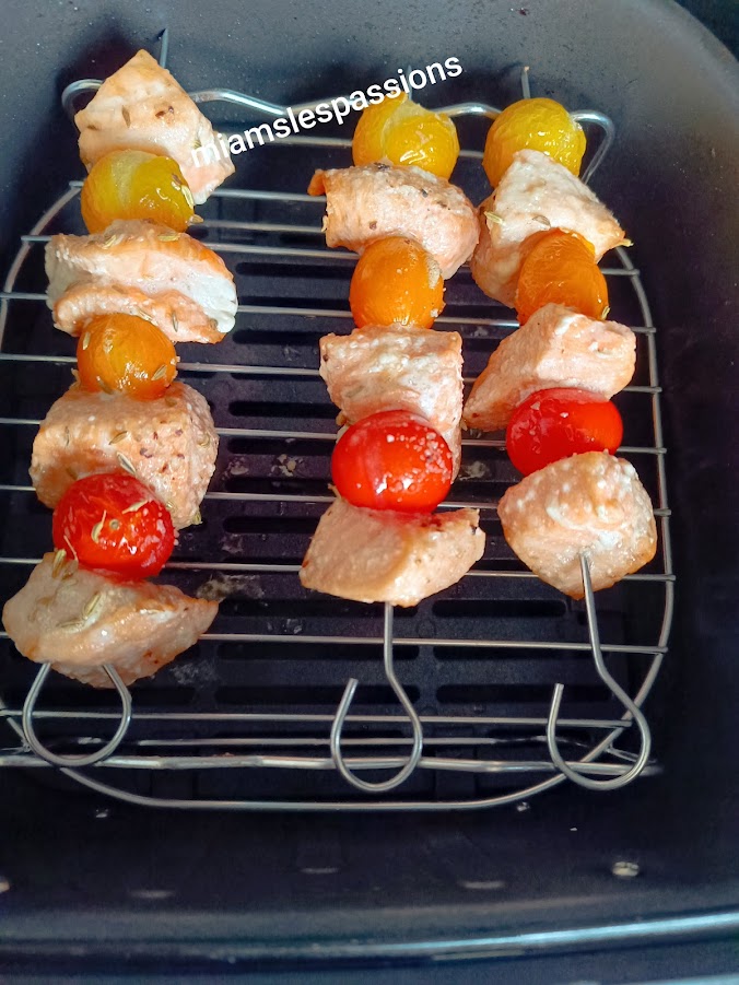 Sur des pics intercaler 1 morceau de dinde , 1 tomate cerise. Parsemé d’herbes de Provence et vaporiser l’huile d’olive. Cuire à l’Air Fryer 200 °/ 10 min .