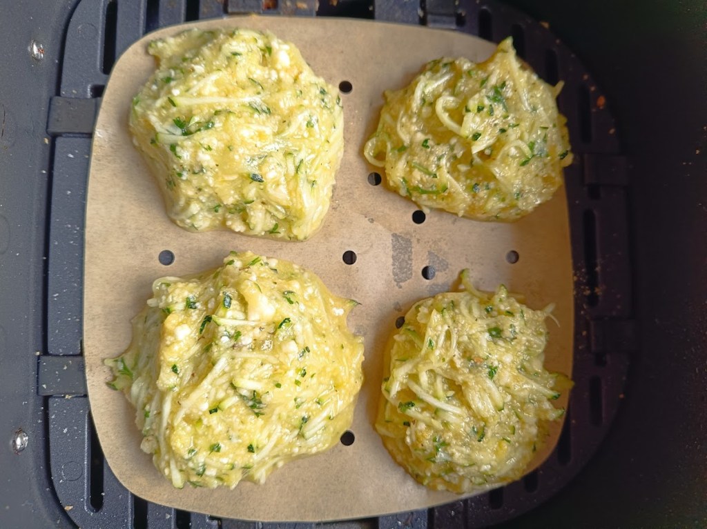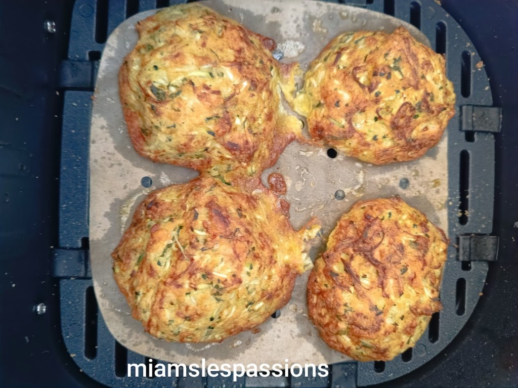 Dans un saladier râper 1 petite courgette, ajouter 1 c à s d’huile d’olive, 1 œuf, 20 g de parmesan, 20 g de chapelure, 1 c à c de persil ail, sel . Bien mélanger le tout. Faire des tas. Programmer l’Air Fryer 190°/15 min. C’est prêt léger et délicieux.