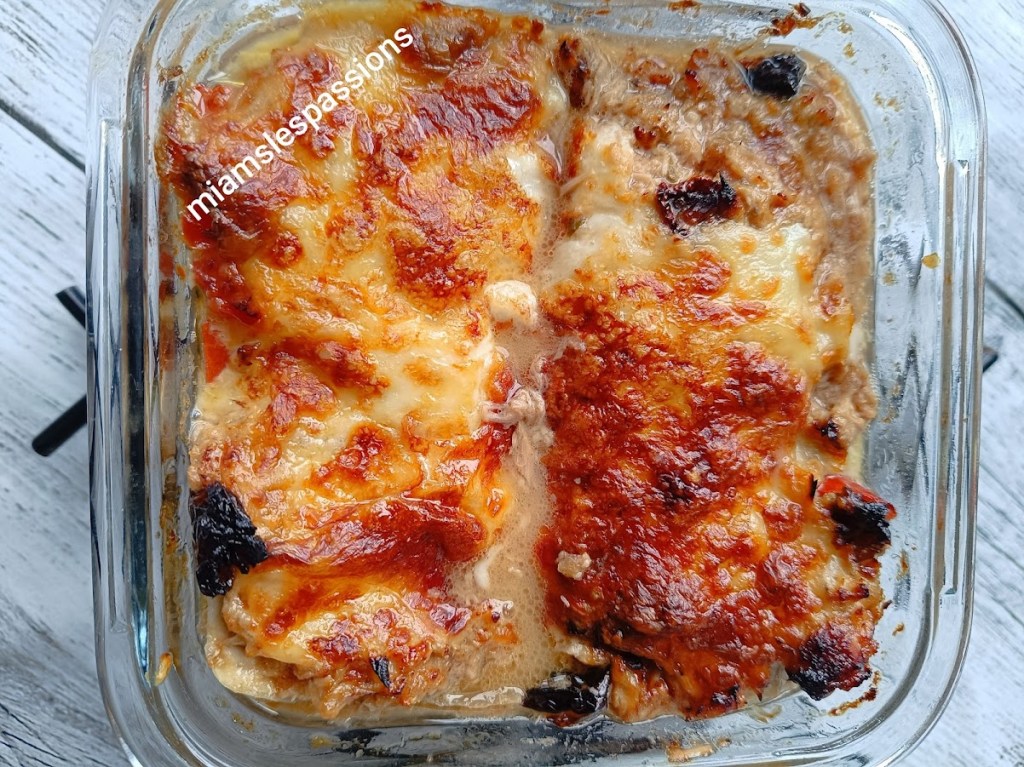 Couper une aubergine en fines tranches. Dans un saladier mélanger une boîte de thon avec une sauce tomate maison, sel et herbes de Provence . Vaporiser le fond d’un plat avec de l’huile d’olive puis mettre des tranches d’aubergines ,une couche de thon à la sauce tomate recommencer et finir par la sauce tomates thon. Couper une mozzarella en deux la poser sur la préparation. Mettre dans l’Air Fryer mode légumes 170°/ 15 min et 190°/10 min.