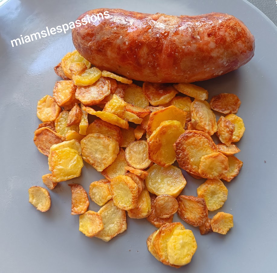 Mettre dans la cuve de l’Air Fryer des pommes de terre coupées en rondelles , vaporiser d’huile d’olive. Programme frites 200°/ 20 min . Au bout de 10 min remuer les pommes de terre mettre la grille avec l’andouillette dessus, vaporiser d’huile et continuer la cuisson 10 minutes . C’est prêt.