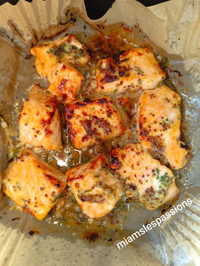 Mettre des morceaux de saumon dans un plat, du persil ail, 1 c à c de miel , 1 c à c de moutarde de Dijon , 1 c à c de moutarde en grain entier, 1 c à c de jus de citron , vaporiser l’huile d’olive . Mélanger le tout , poser dans l’Air Fryer 200°/ pendant 12 min.