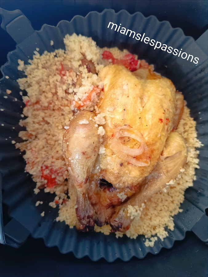 Dans un plat allant dans la friteuse éparpiller 1/2 oignons coupés en rondelles , 2 tomates coupées en cube , poser le coquelet dessus, le vaporiser d’huile d’olive. Programmer l’appareil190°/20 min .A la sonnerie retourner le coquelet et continuer la cuisson 190°/ 15 min . 5 min avant la fin mettre de la semoule couscous.