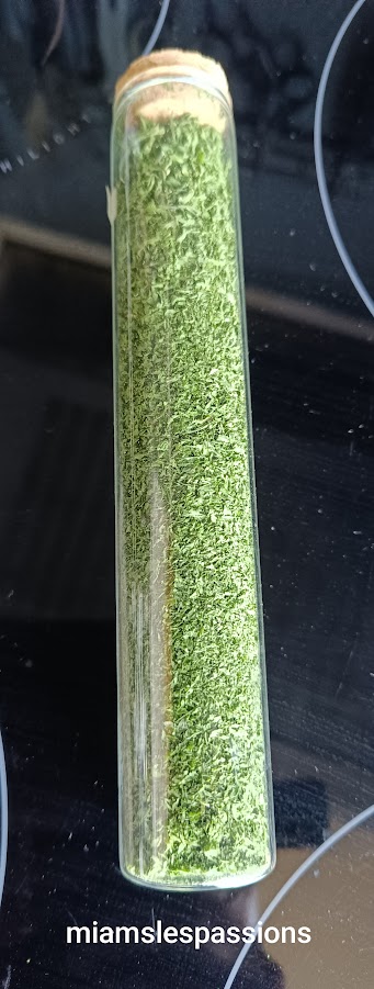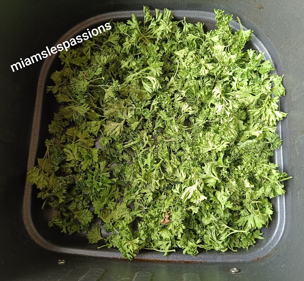 Mixer le persil propre et le mettre dans la cuve de l’air fryer, j’ai mis une grille qui sert aussi au barbecue par-dessus pour pas que le persil vole .Programmer l’Air Fryer 80°/30 min. Ensuite je l’ai mis en poudre ou vous pouvez le laisser tel quel.