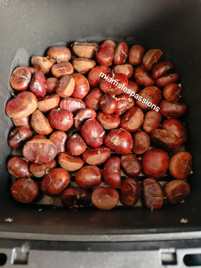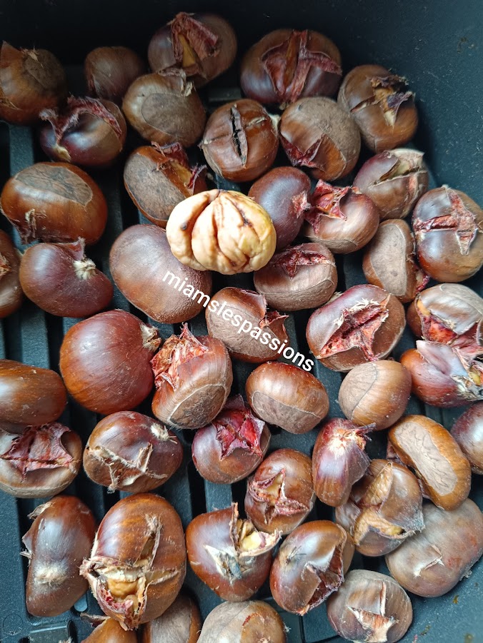 Ramasser des châtaignes, les laver puis les mettre dans une casserole d’eau que vous porterez à l’ébullition . Eteindre le feu . Rincer les marrons à l’eau froide puis entailler en croix. Disposez-les dans l’Air Fryer 200°/15 min . Elle s’épluche facilement.