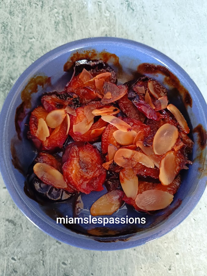 Dans des ramequins allant dans la friteuse mettre des moitiés de prunes , parsemé d’amande effilée puis verser du miel de fleurs dessus. Programmer l’appareil Air Fryer180°/10 minutes.