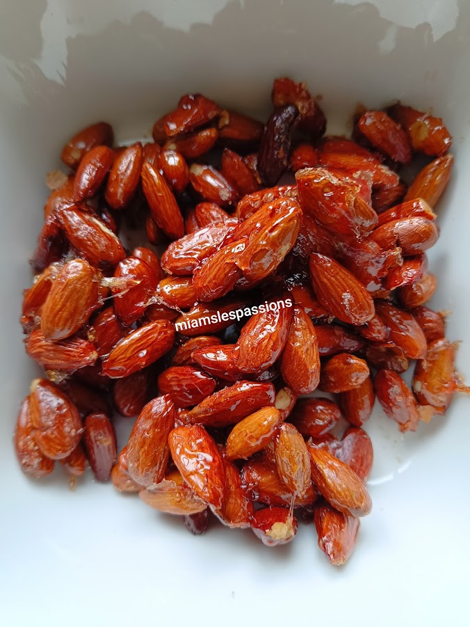 Sur un papier sulfurisé pour Air Fryer mettre 125 g d’amande entière, 3 cuillères à soupe d’eau, 2 cuillères à soupe de sucre. Bien mélanger avec les amandes . Cuire 15 min / 180°en mélangeant toutes les 5 minutes.