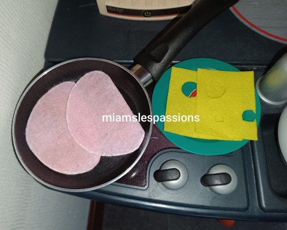 Un petit kiff du jour . J’ai réalisé avec de la feutrine rose et légèrement feutré marron des tranches de jambon avec un contour blanc faisant le gras et avec de la feutrine jaune j’ai réalisé de l’emmental