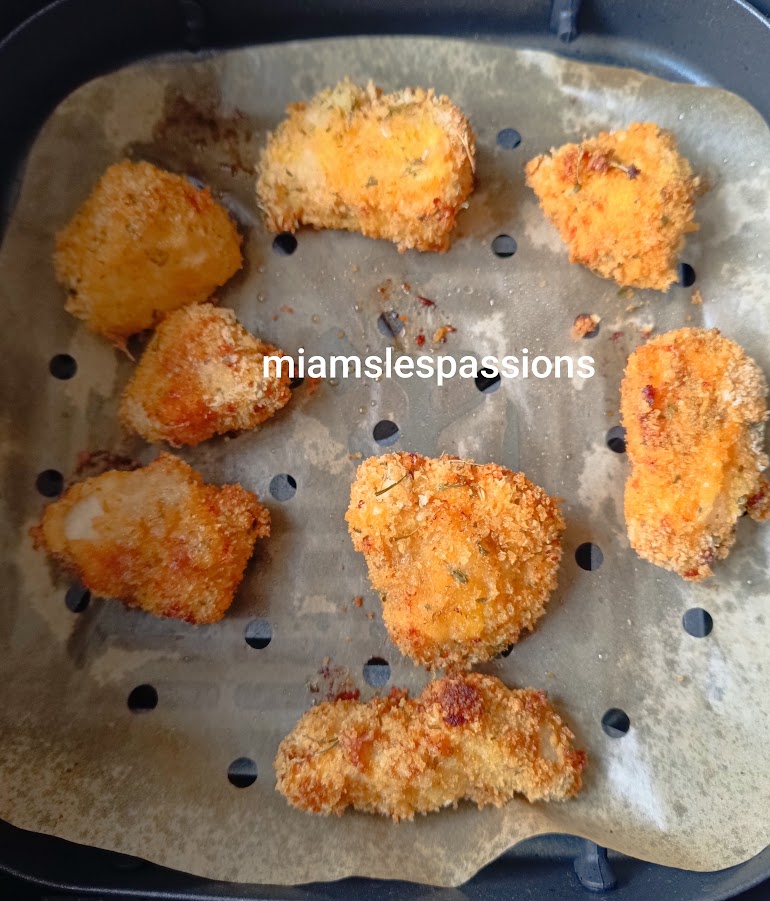 Couper un filet de poulet en morceaux (comme sur la photo). Préparer 3 bols : 3 c à s de farine, 1 œuf battu avec un peu de lait, et le dernier de la chapelure ou panko mélangée à du persil. Enrober chaque morceau successivement de farine, d’œuf puis de panko (pour moi). Disposer les morceaux dans le panier de la friteuse Air Fryer sans les superposer, vaporiser légèrement d’huile d’olive sur les nuggets .Programmer l’appareil 180°/15 min retourner à mi-cuisson . Servir chaud.