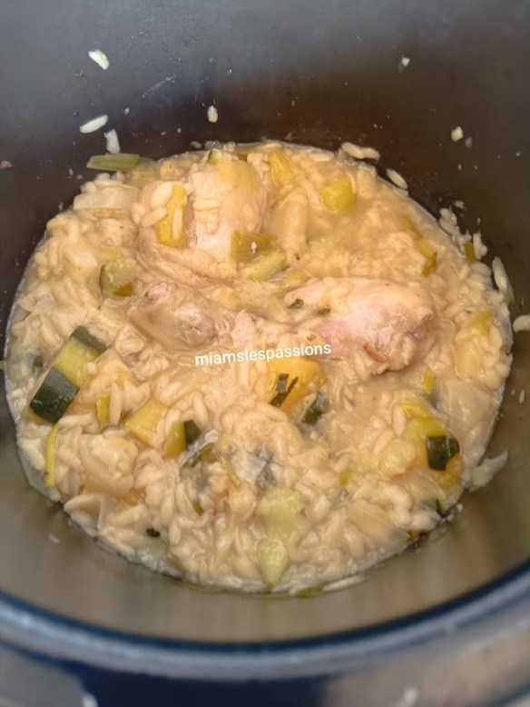 Dans la cuve du Cookéo mettre 1 c à s d’huile d’olive et faire revenir 1/4 d’oignon avec 2 pilons de poulet . À la sonnerie ajouter 2 carottes, 1 panais ,1/4 de chou ,1 courgette , 1 poireau , 1 branche de céleri épluchées et coupées en morceaux ,1 cube de bouillon volaille et 130 g d’orzo . Recouvrir d’eau. Mettre le Cookéo sous pression pendant 10 minutes. À la sonnerie servir.