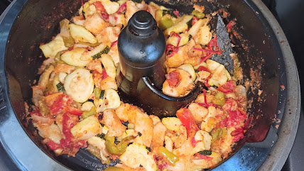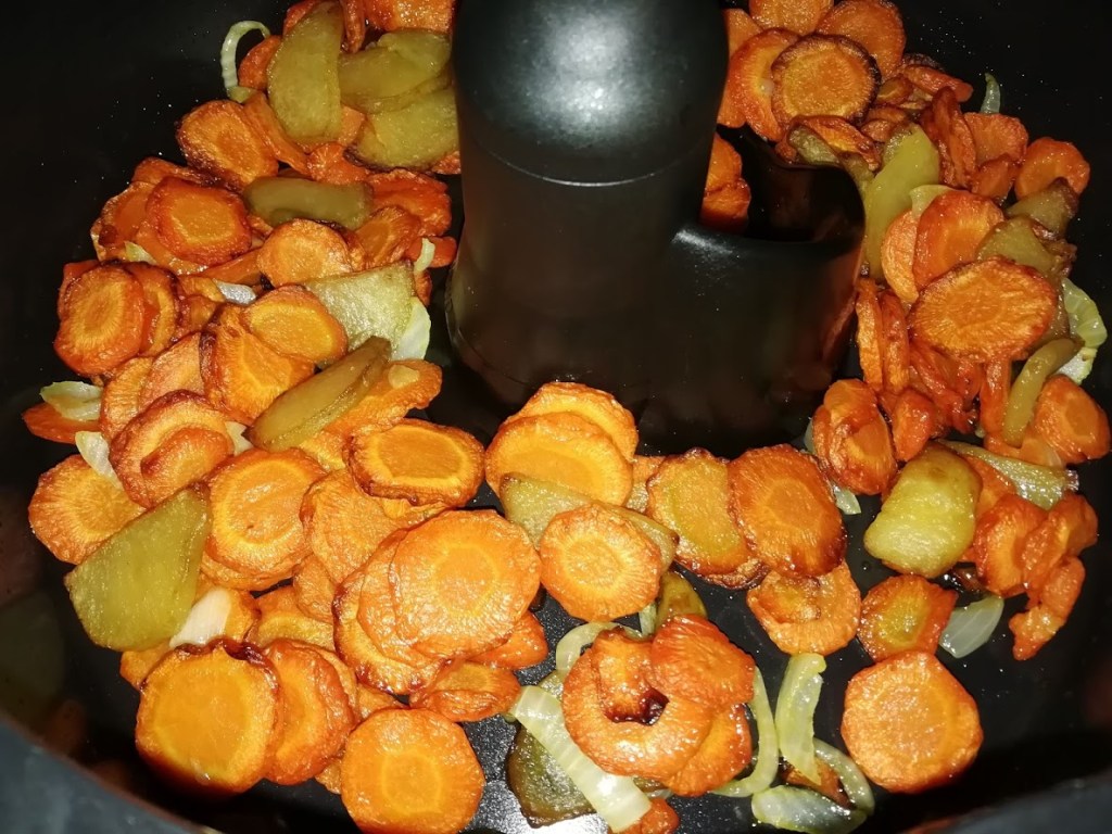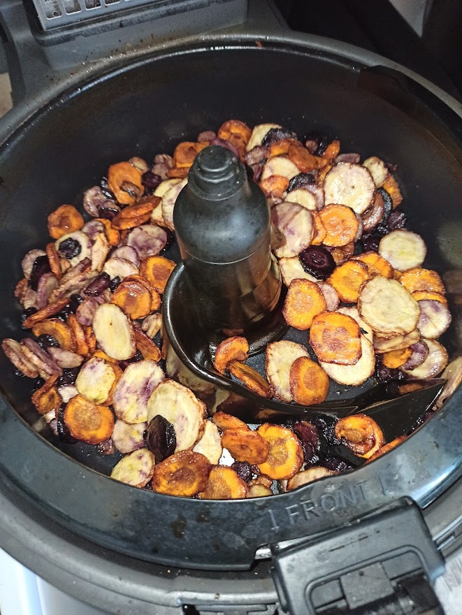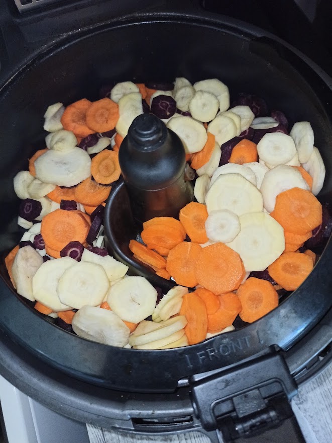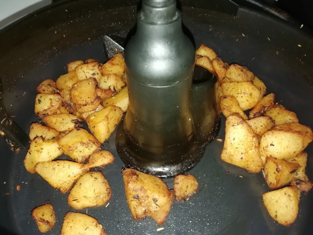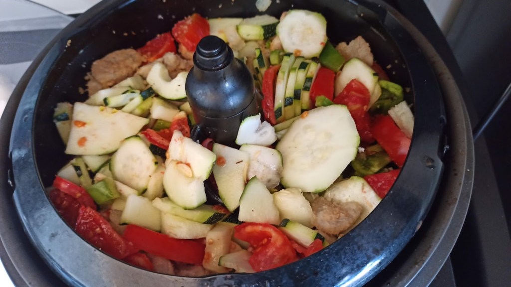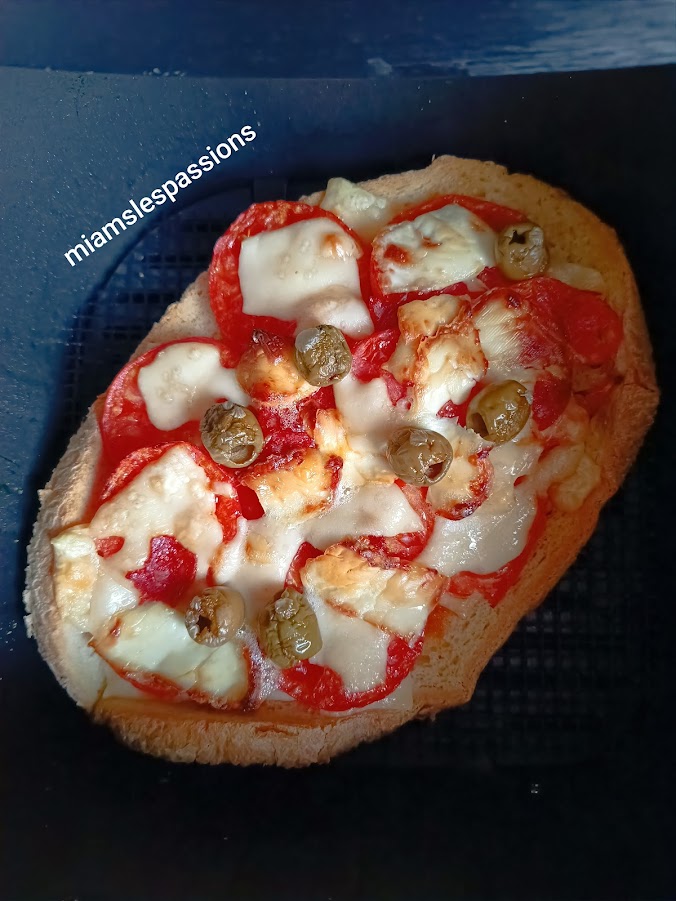 Vaporiser le pain d’huile d’olive. Programmer l’Airfryer grill 5 minutes. À la sonnerie ajouter sur le pain des tranches de gruyère, des tomates coupées en lamelles, des rondelles de chorizo, du gruyère râpé, des morceaux de chèvre et quelques olives. Vaporiser d’huile d’olive et continuer la cuisson 180°/8 min .