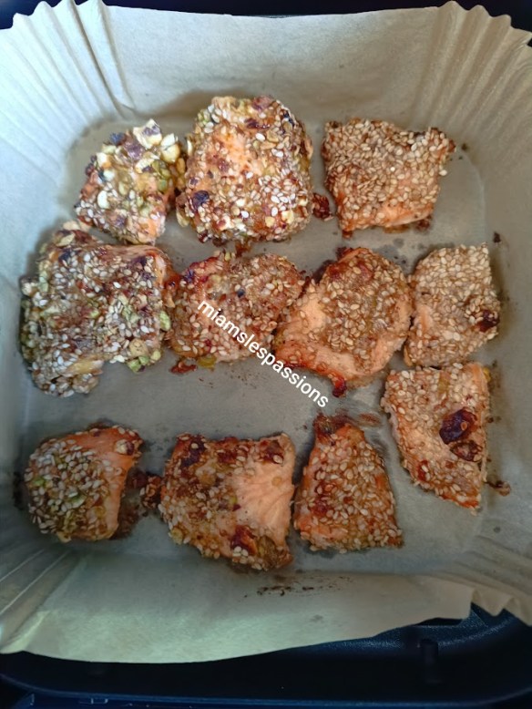 Dans un bol mettre 1 c à c de moutarde, 1 1/2 c à c de miel et un peu d’huile d’olive . Bien mélanger. Badigeonner un par un les morceaux de saumon . Dans une assiette mettre des graines de sésame ainsi que des pistaches concassées mélanger et y mettre les morceaux de saumon placez-les dans l’Air fryer . Programmer celui-ci mode poisson.