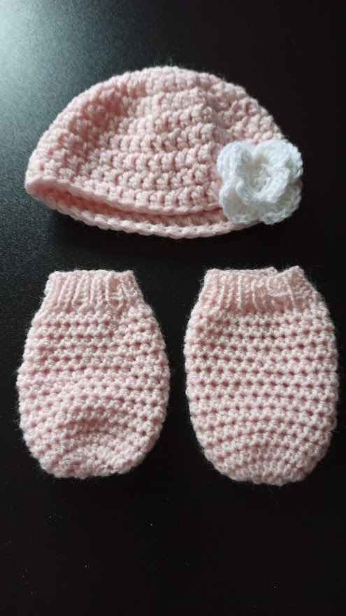 Voici un petit ensemble naissance bonnet et gants réalisé au crochet.