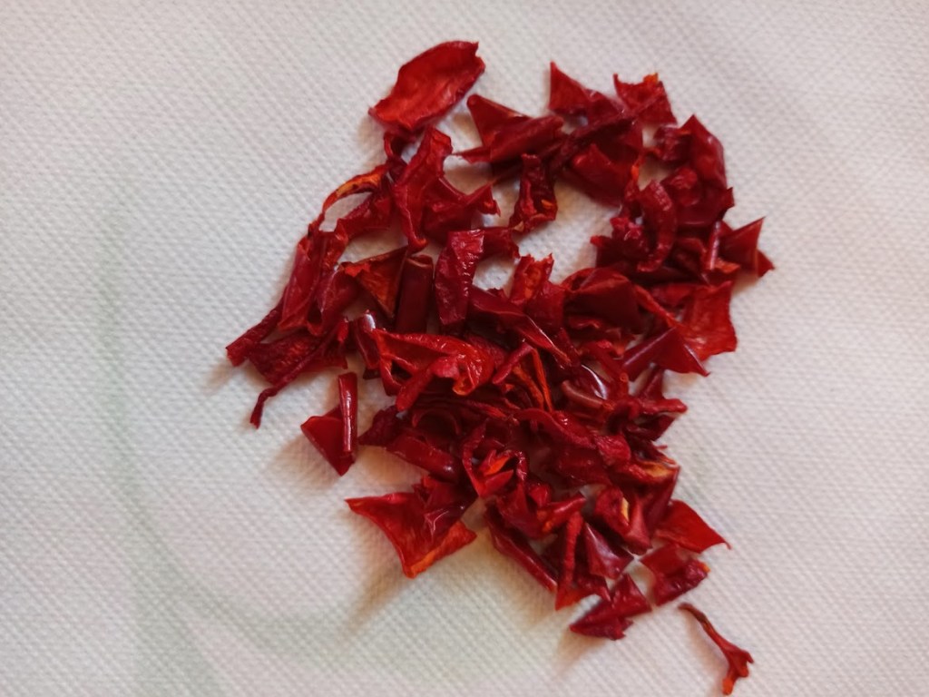 Épépiner les poivrons où les piments ,les couper en morceaux puis les mettre dans le déshydrateur pendant 3h à 70°. Quand c’est bien sec mettre dans le Thermomix 5 vit/10 quelques secondes. Verser dans un pot.