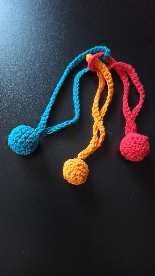 Bonjour avec des couleurs assez vive j’ai crocheté autour de 2 perles et autour d’un grelot ,puis j’ai fait des chaînettes avec un rend de demi bride . C’est simple et rapide à faire.