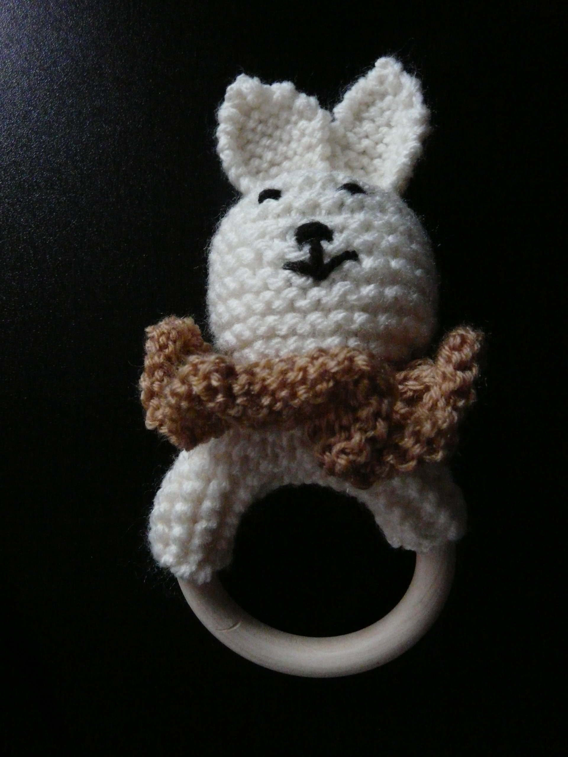 Voici un hochet petit lapin tricoter avec sa collerette.