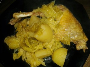 Dans la mijoteuse mettre la pintade coupée en morceaux ,le chou lavé et coupé ainsi que des pommes de terre épluchées et coupées en gros morceaux.Laisser mijoter 3h30.