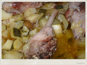 Faire revenir des manchons de canard dans un peu d’huile d’olive , les mettre dans la mijoteuse. Ajouter des pommes de terre et des courgettes coupées en carrés et 1/2l de bouillon de volaille . Laisser mijoter 3h.