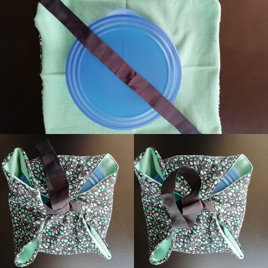 J’ai réalisé un sac à tarte baluchon très simple à faire pour transporter vos tartes, saladier pour le pique-nique . Couper 2 carrés de coton enduit de 50 cm / 50 cm . Sur un carré endroit dans 2 coins opposés , épingler un ruban de 20 cm plié en 2 et dans les coins opposés mettre un ruban de la longueur de la diagonale , remettre le deuxième tissu sur endroit contre endroit et piquer tout autour en laissant un espace pour remettre le tissu à l’endroit . C’est terminé.